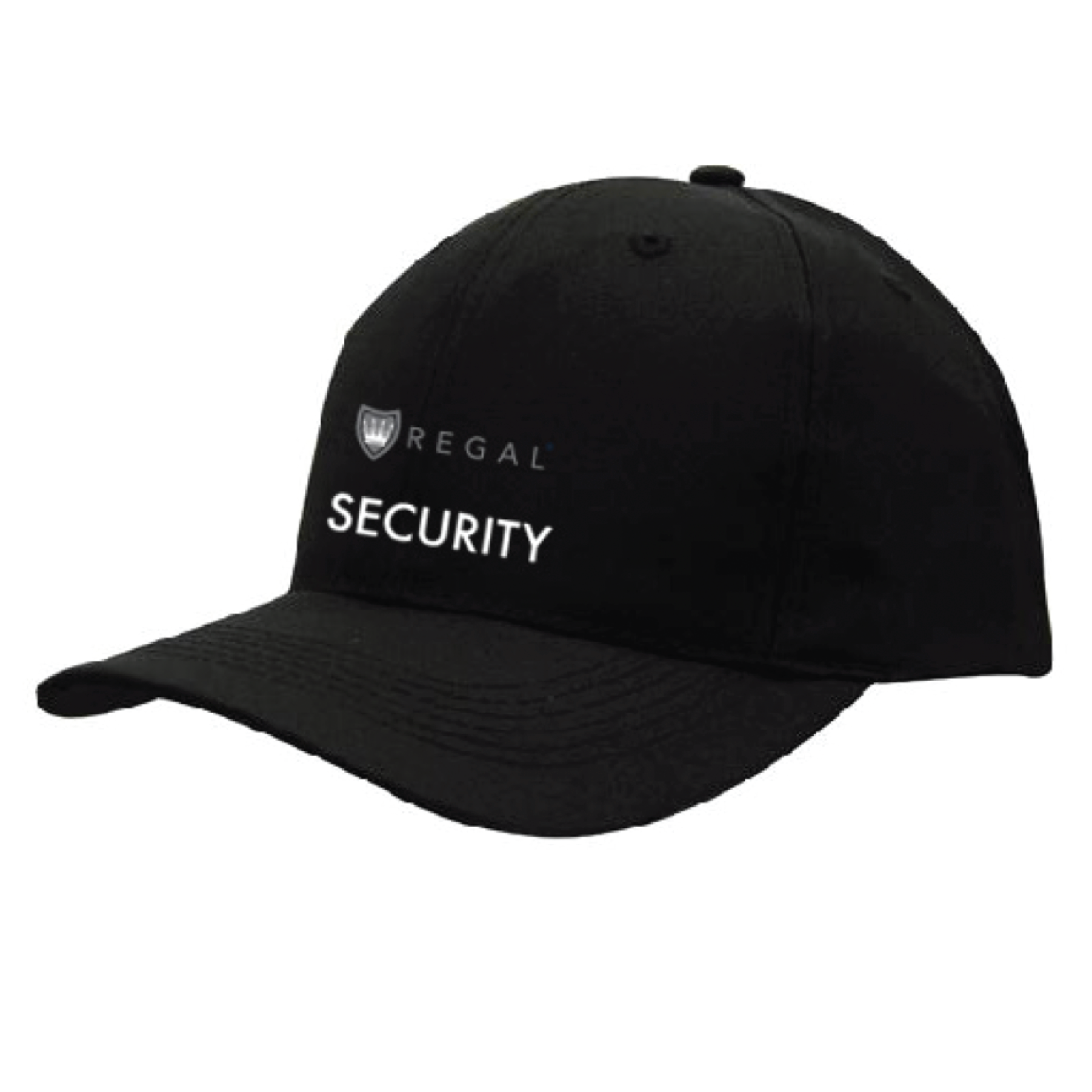 Breathable poly twill, structured 6 panel low profile pre-curved peak fabric covered short touch strap Decoration: Front - Regal Security, embroidered